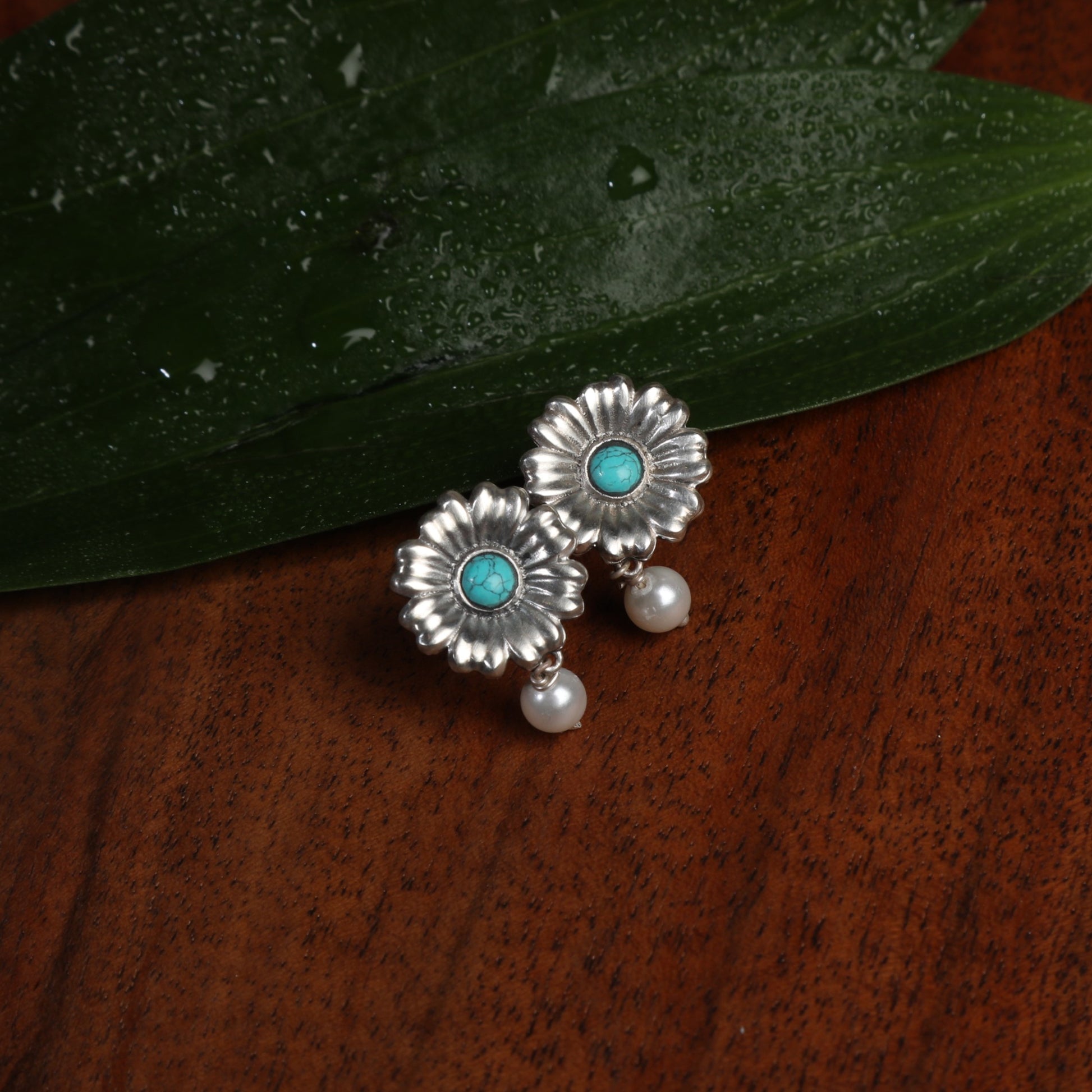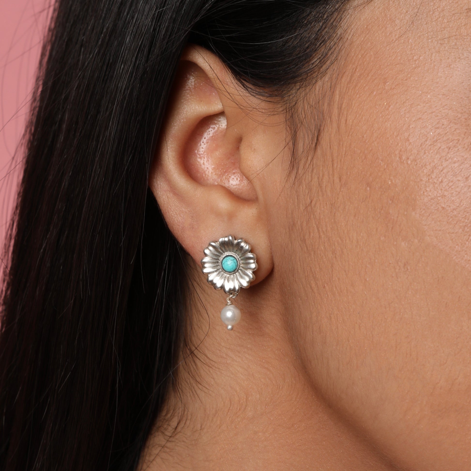 These earrings have been crafted taking in mind the urge for minimal jewelry which is simple but still eye catching. Studded with the turquoise stone and dangling pearls, it is for sure a perfect everyday jewelry for you.
