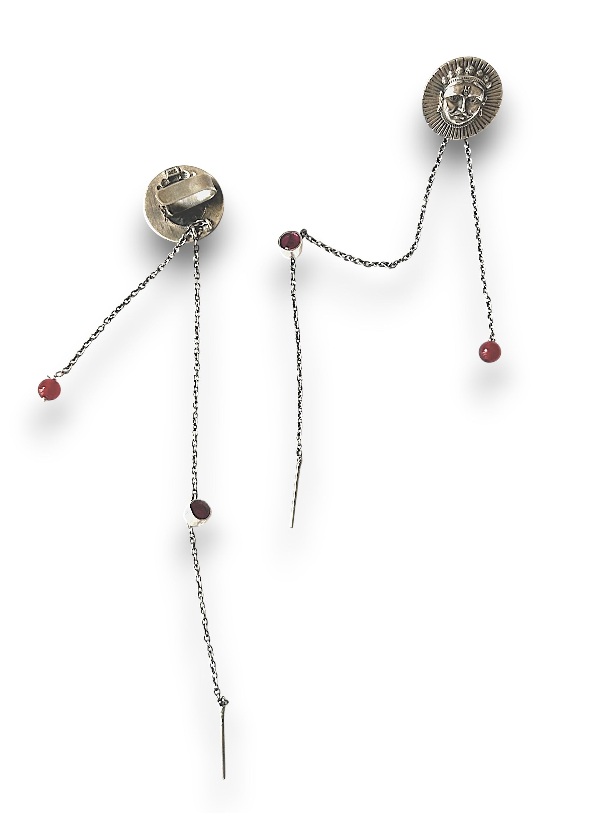 Each earring begins with a sunburst stud, handcrafted in pure silver, representing the radiance of Surya, the deity from whom the rulers of Mewar trace their divine lineage. Suspended from the sun are delicate silver chains, cascading like rays of light, swaying with every movement — soft, powerful, timeless.