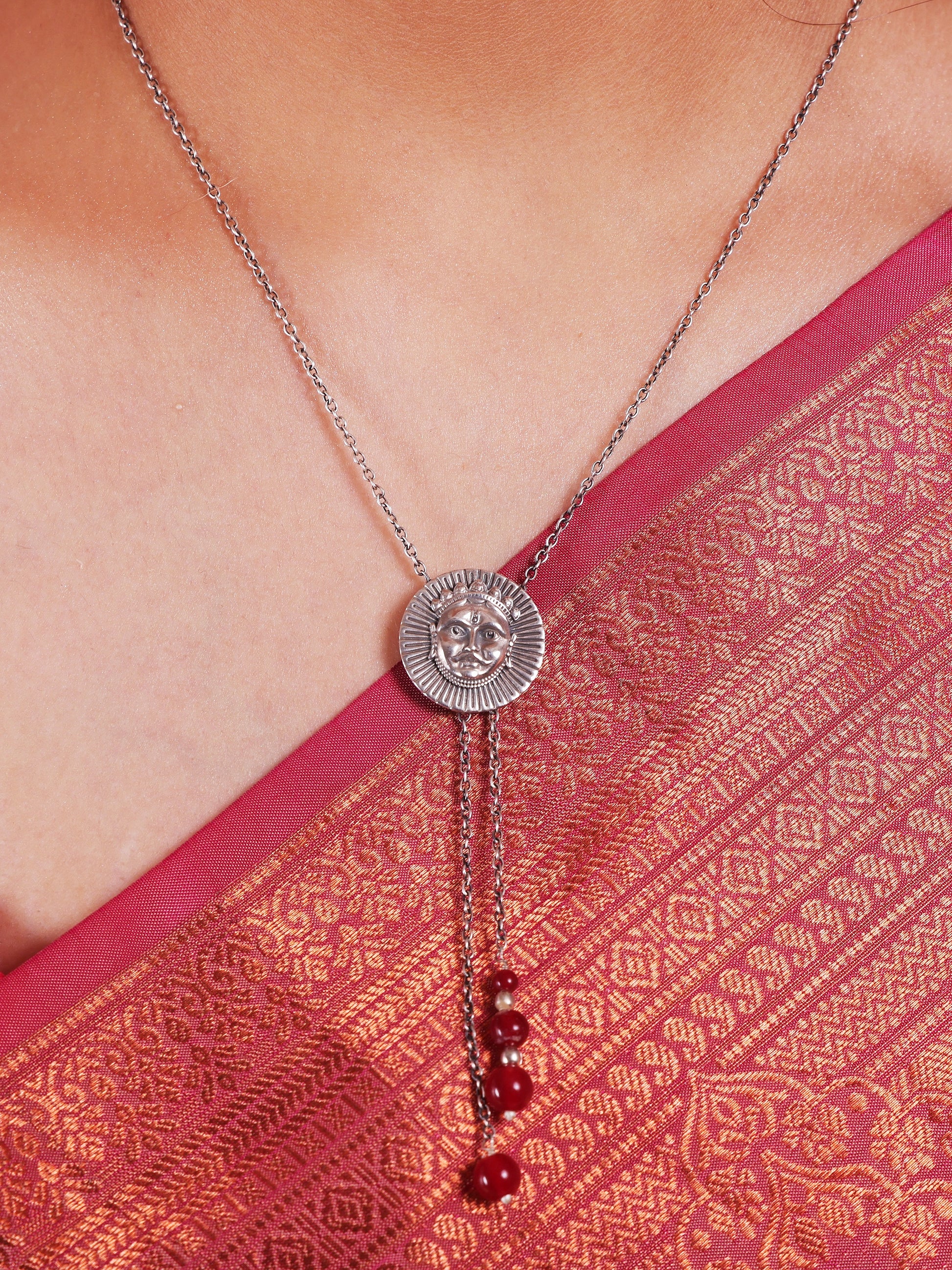 This handcrafted silver chain necklace captures that radiant heritage. The design features fine links and a central sunburst medallion, inspired by ancient royal insignias found on palace gates, armor, and ceremonial coins. Oxidised detailing brings out the depth of the engraving, making every ray of the sun feel alive, eternal, and powerful.